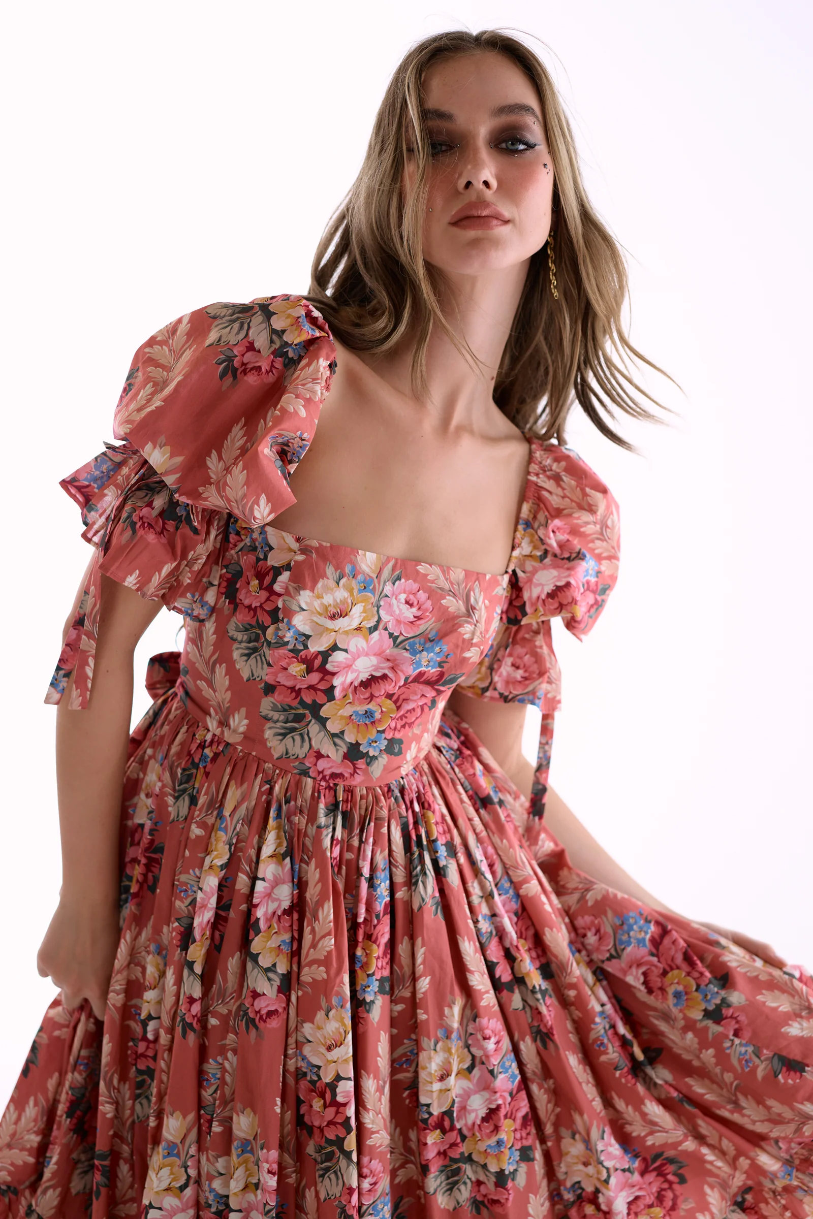 Featuring a floral print in rich seasonal colors that evoke changing leaves, this paper cotton high-waist midi dress celebrates fall's quiet elegance. A pleated puff skirt and charmingly ruffled hem create romantic volume, while bows at the sleeve and waistline add charming detail. Complete with pockets, it's perfect for when you want to feel as beautiful as the season.