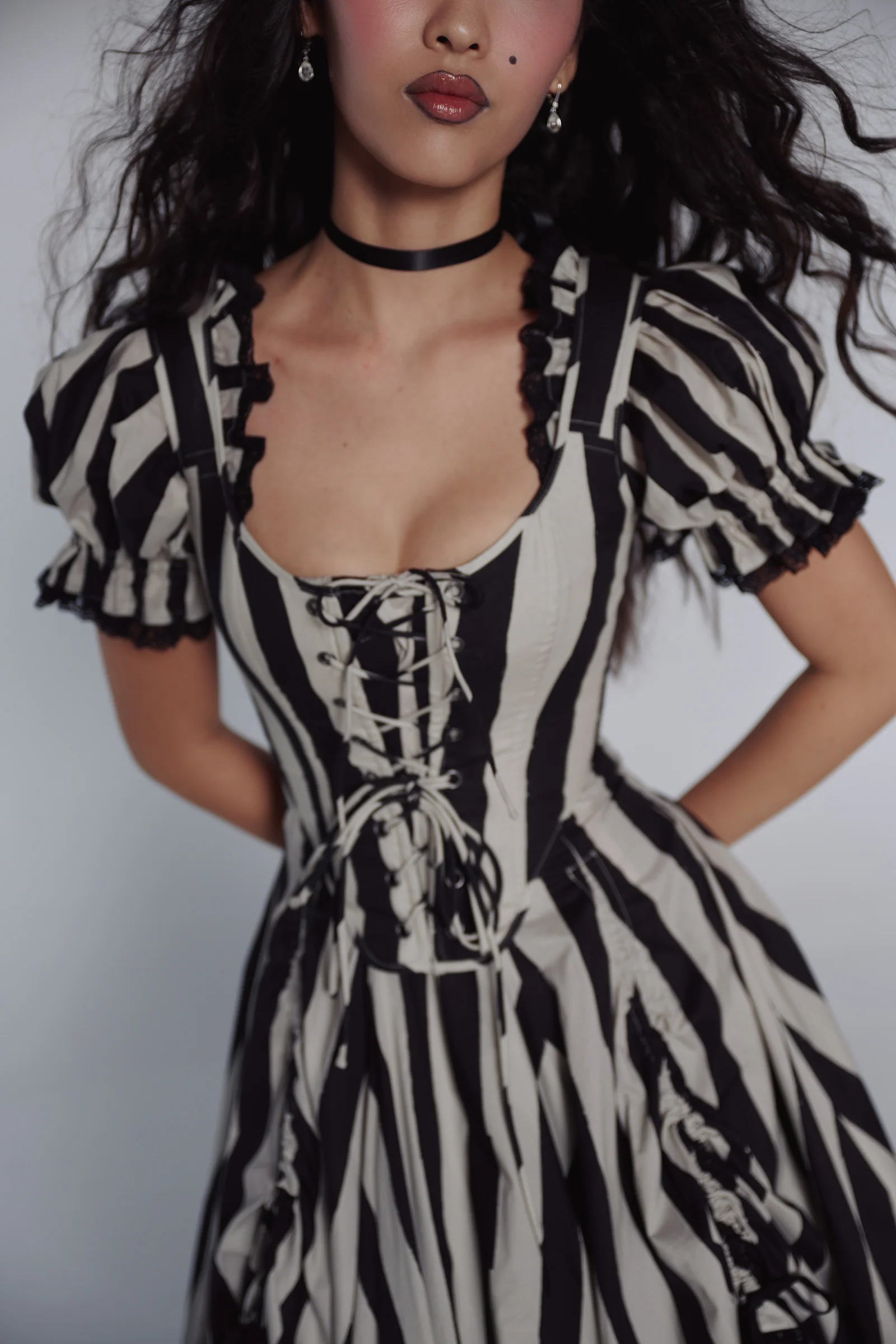 The Duchess Corset returns in a striped print drawing from the atmospheric beauty of Sleepy Hollow and inspired by the gown worn by Virginia Saint George in the 90s TV miniseries “The Buccaneers.” This cotton corset is fully boned and laces up with two draw cords so that you can control the cinching effect to your liking.