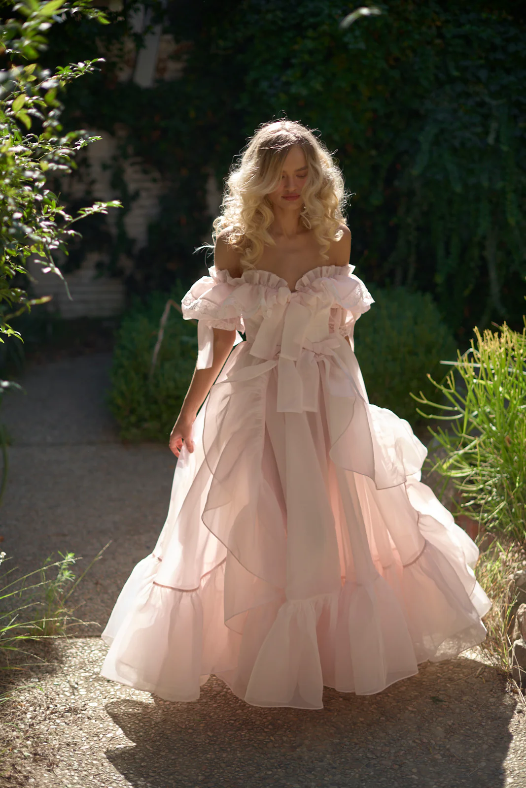 This voluminous organza gown, which features puff sleeves, gorgeous bows, and ruffled lace trim. Designed to celebrate the body, this gown features full underwire cups, an off-the-shoulder neckline, and boning at the waist. Savor the visual decadence of Confection, where this delicate, airy pastel looks sweeter than a cream puff dusted with snow powdered sugar. Â