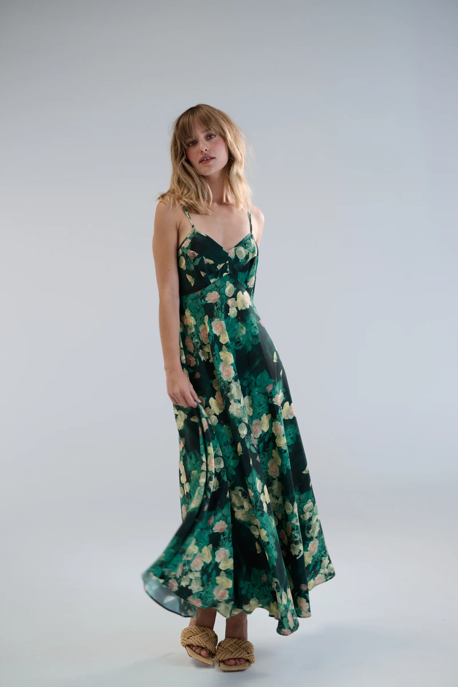 Drift through the moonlit in The Enchantment Norma Jean Slip, which depicts rich, dark roses blooming throughout a shadowy forest. Crafted from luxurious, matte opaque vintage silk with a delightfully cool touch, it's cut on the bias to offer a natural, accommodating fit. The dress's subtle A-line silhouette adapts gracefully to various bust and tummy shapes. With its invisible zipper and fit-and-flare design accentuating all the right curves, you'll feel like the protagonist of your own enchanted evening.