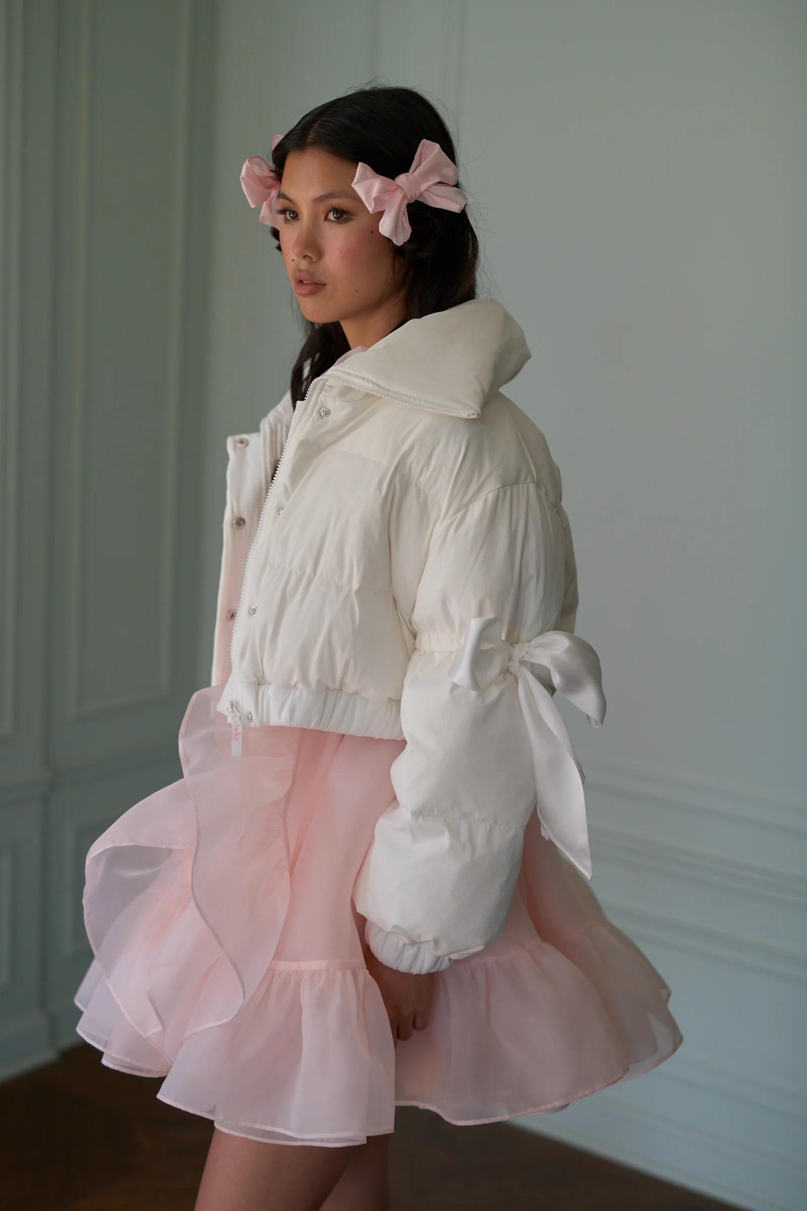 Become the consummate snow bunny in the Ivory Marshmallow Puffer, fit for a ski angel skimming down the slopes, a vision in white against a clear blue sky. This is a decadent hug of a puffer jacket, cropped perfectly to your true waist. The super soft, high quality material includes lining made from the same fabric as the outer coat, for a luxurious interior. The extravagant tall collar zips all the way up to protect you from the cold, and the bows are functioning drawstring satin ribbons.