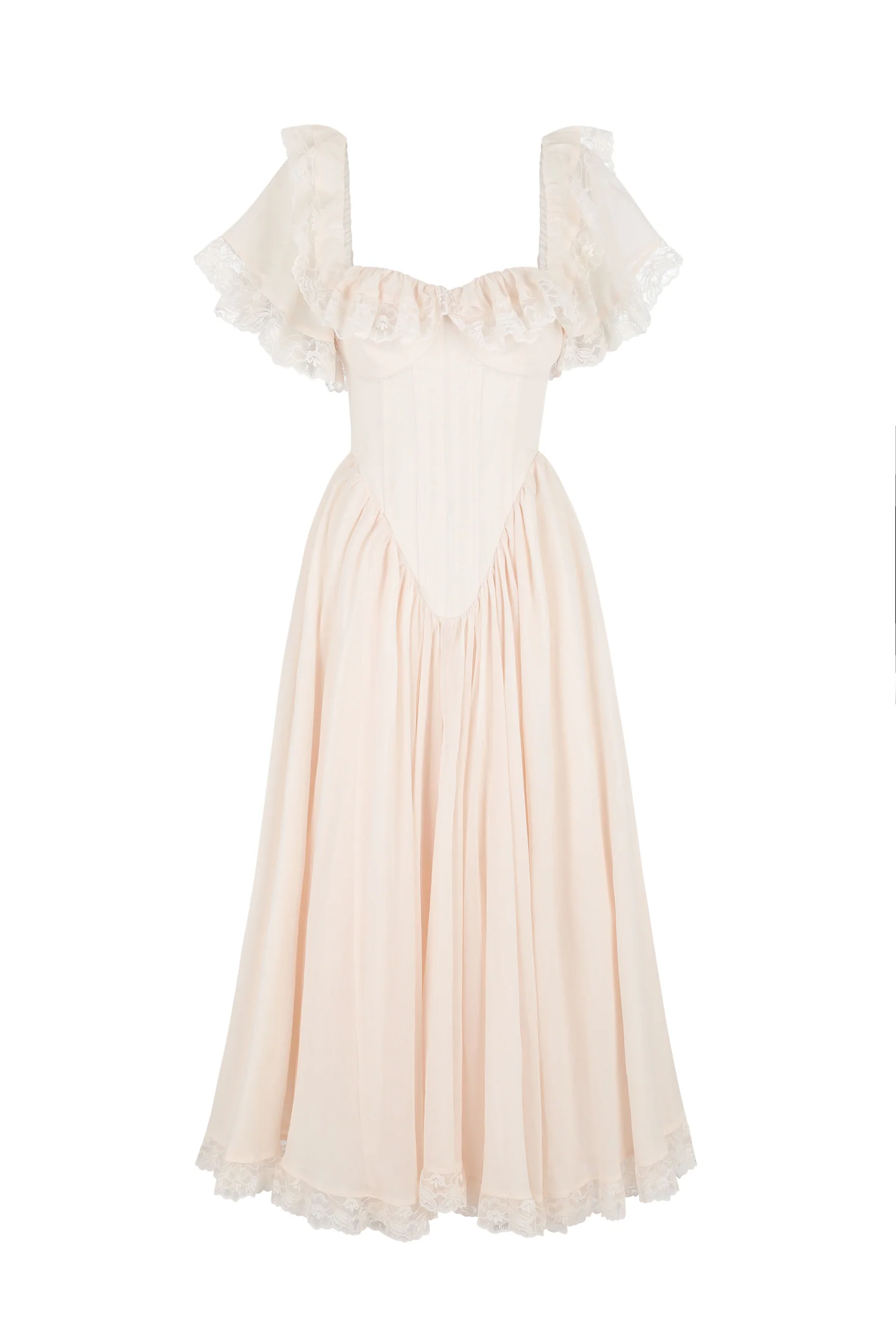 Lickety Split pink, the soft signature shade Selkie collectors know by heart. This cotton gauze Basque waist corset midi is for the collectors. Underwire cups and boning at the waist for structure, side bustling, corset lacing at back, lace trim throughout. Soft, sweet, unapologetically feminine.