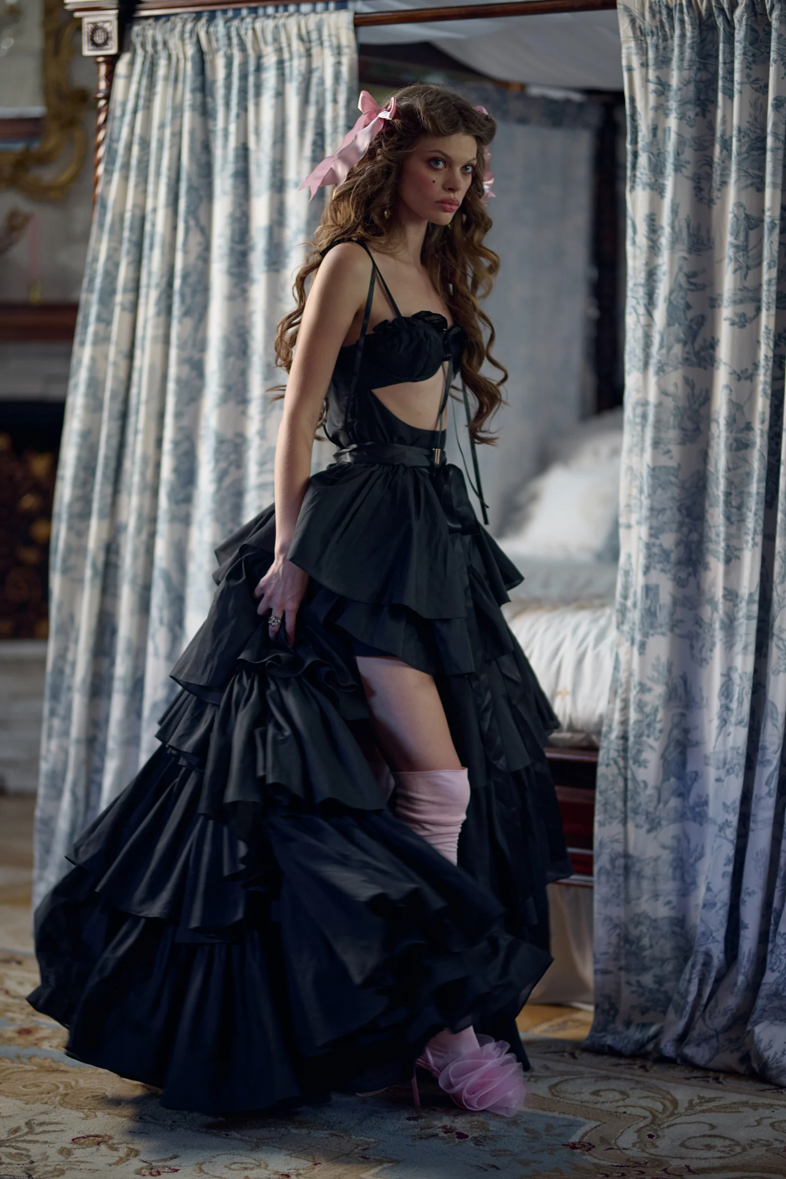 Including the voluminous open-front tiered ruffle maxi skirt with a gold clip fastener and wraparound satin ribbon