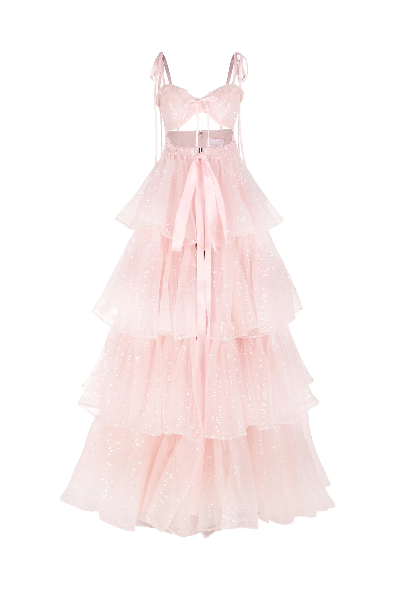 Channeling the splendor of Aphrodite or Ostara, this two-piece ensemble features a glittering, slinky slip dress with a coquettish bow-tied bust. Ideal for a radiant goddess, the voluminous open-front tiered ruffle maxi skirt, adorned with an extra-long satin ribbon to cinch the waist, is lavishly embellished with sequins.